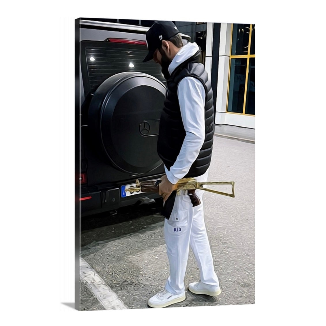 Oil painting print of Islam posing with his gold plated AK.